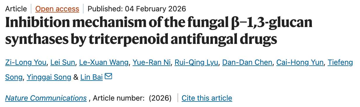 2026年2月4日,北京大学基础医学院柏林课题组在Nature Communications杂志在线发表了题为Inhibition mechanism of the fungal β-1,3-glucan synthases by triterpenoid antifungal drugs的研究论文,系统揭示了三萜类抗真菌药物靶向β-1,3-葡聚糖合成酶的抑制机制,以及临床耐药突变的作用机制,为改造现有抗真菌药物和靶向β-1,3-葡聚糖合成酶的新型药物研发奠定了基础。