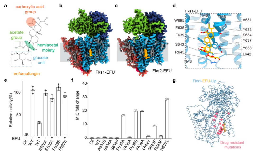 该研究利用冷冻电镜解析了真菌两种β-1,3-葡聚糖合成酶Fks1与Fks2在apo状态及结合三萜类药物分子Enfumafungin复合物的三维结构,结合突变体酶活与抑菌实验,识别了三萜类药物分子在FKS跨膜区的特异结合位点,并进一步分析解释了临床相关耐药突变的结构基础(图1)。Enfumafungin是一种三萜类天然产物,在2000年被发现具有抗真菌活性,进一步改造合成的Ibrexafungerp在2022年上市。本研究发现三萜类分子主要贴附在FKS的跨膜螺旋TM5上,并未引起靶点结合区的构象变化,而是诱导稳定了周围的麦角固醇分子,通过重排邻近脂质微环境将FKS稳定在特定构象(basal state)(图2a-c)。